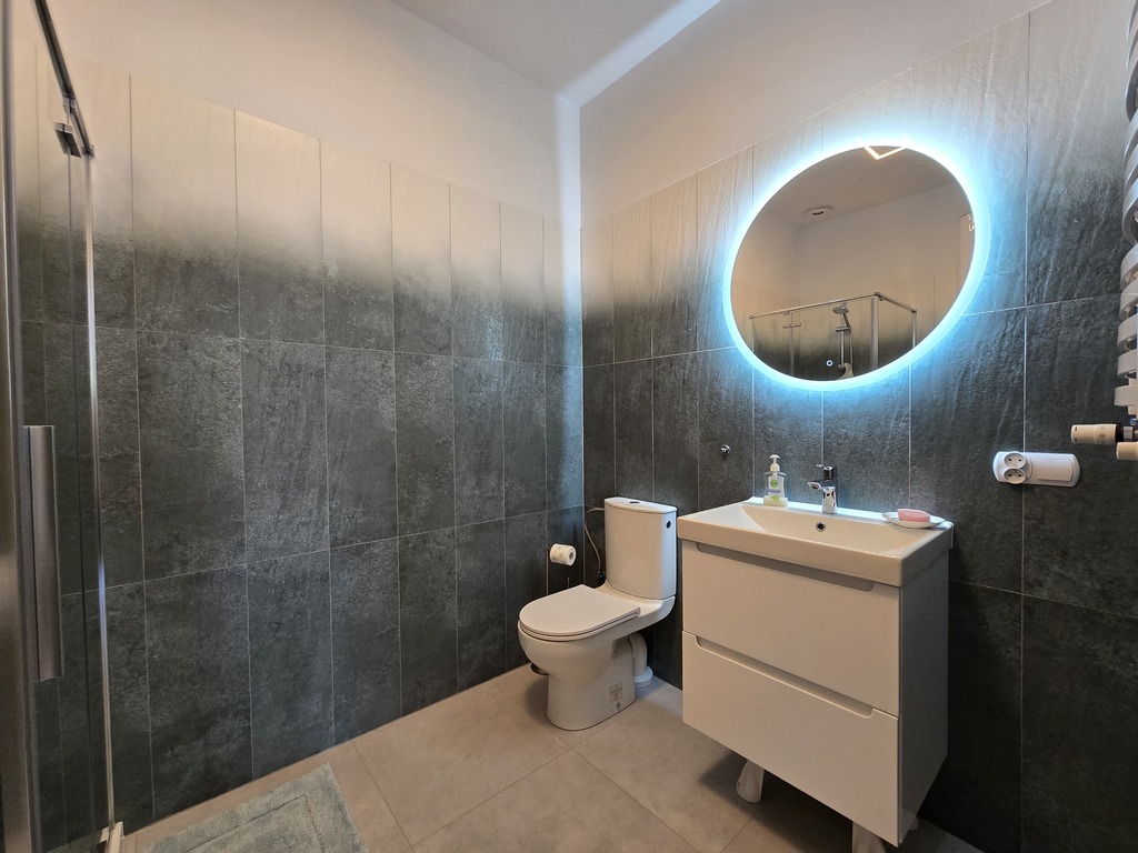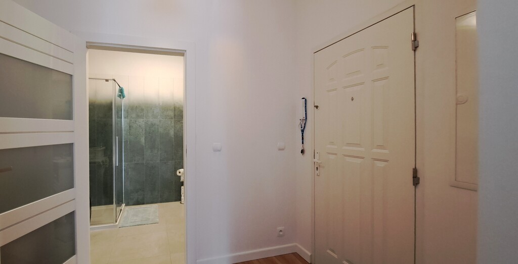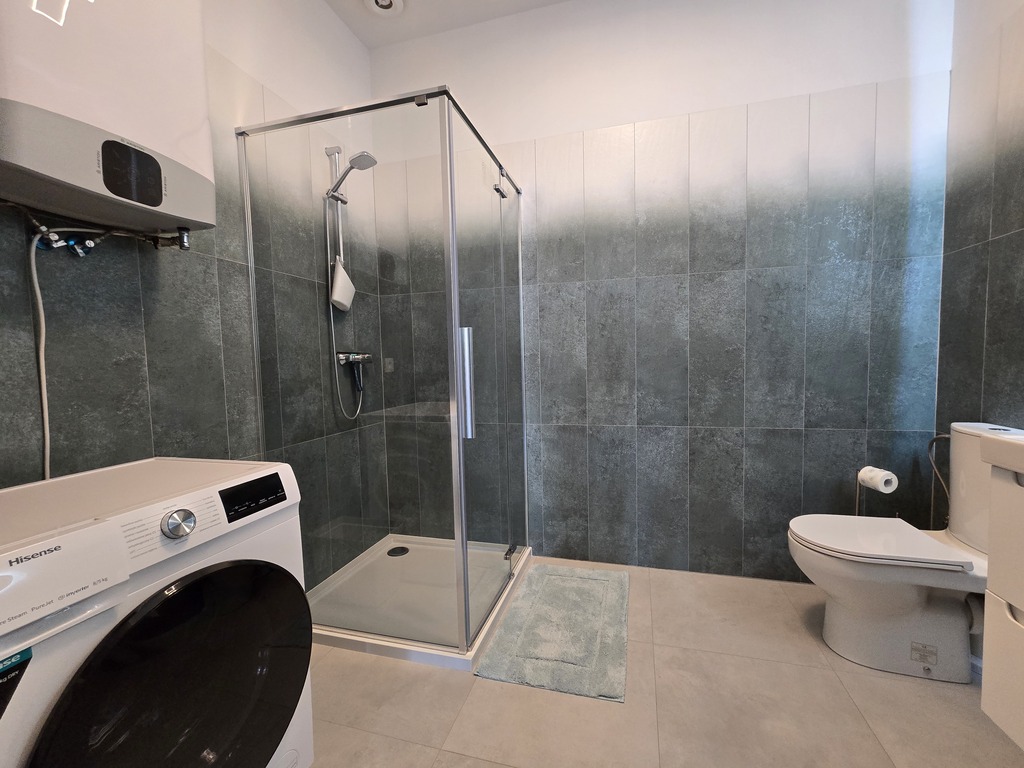 W łazience kabina prysznicowa, umywalka, pralka, bojler elektryczny; ogrzewanie podłogowe.