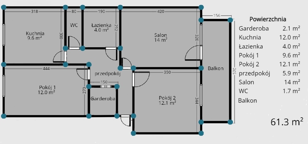 61.30 m²Liczba pokoi: