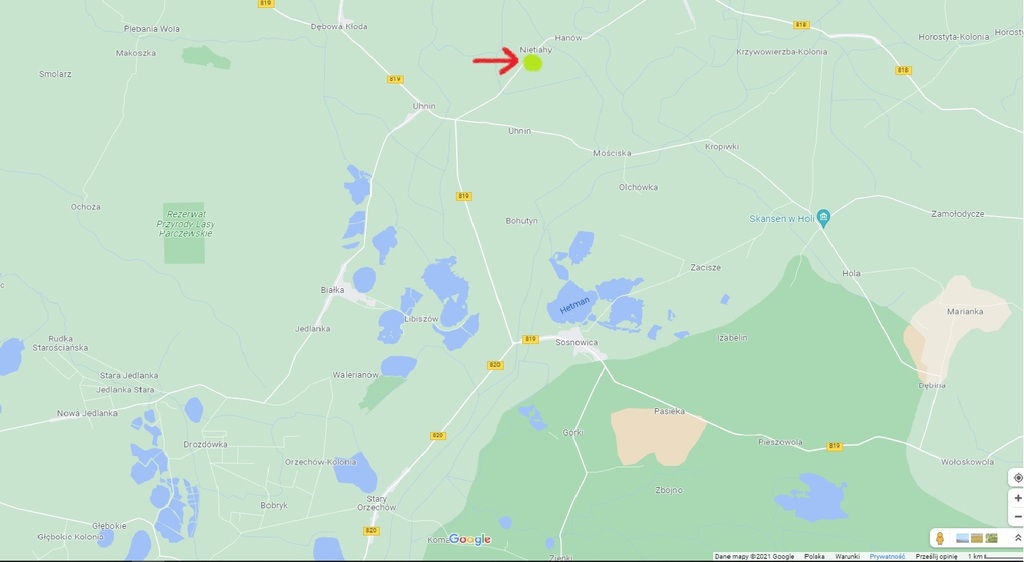 Na sprzedaż duża działka budowlana, położona we wsi Nietiahy, gmina Dębowa Kłoda. Powierzchnia działki wynosi 0,3000 ha (3000 m2) i na szerokości 45 metrów, bezpośrednio przylega do drogi asfaltowej biegnącej ze wsi Uhnin do wsi Kodeniec. Długość działki wynosi 66 metrów. Działka aktualnie w użytkowaniu rolniczym. Gmina Dębowa Kłoda nie posiada aktualnego Planu Zagospodarowania Przestrzennego, według Studium Uwarunkowań i Kierunków Zagospodarowania Przestrzennego cała działka położona jest w terenach rolniczo-osadniczych i mieszkaniowych z dopuszczeniem usług. Wodociąg gminny, linia energetyczna i telefoniczna są dostępne w pasie drogowym. Zaraz za działką, od strony południowo-wschodniej, znajduje dość duży, brzozowo-sosnowy zagajnik leśny. Gmina Dębowa Kłoda, to znakomite miejsce zarówno do zamieszkanie jak i do rekreacji. W odległości zaledwie 9 kilometrów znajduje się miejscowość Białka, z bardzo lubianym przez wędkarzy i plażowiczów jeziorem Bialskim, potocznie nazywanym Białką, z dogodną bazą noclegową i gastronomiczną, ośrodkami wypoczynkowymi i wyznaczonymi kąpieliskami.