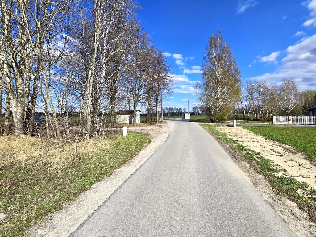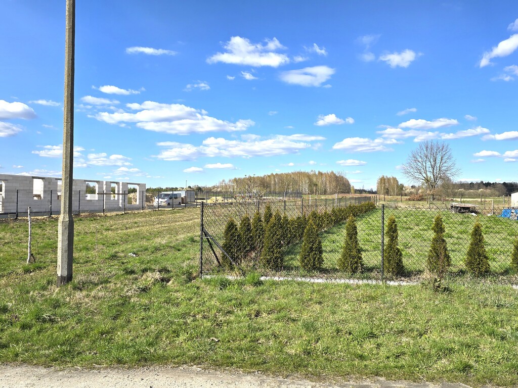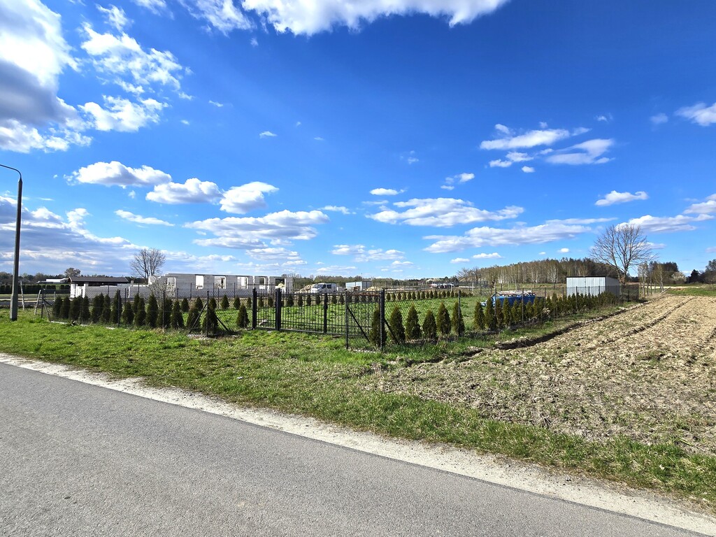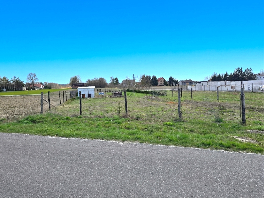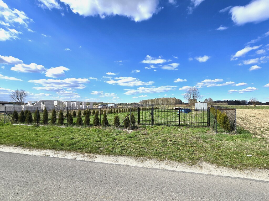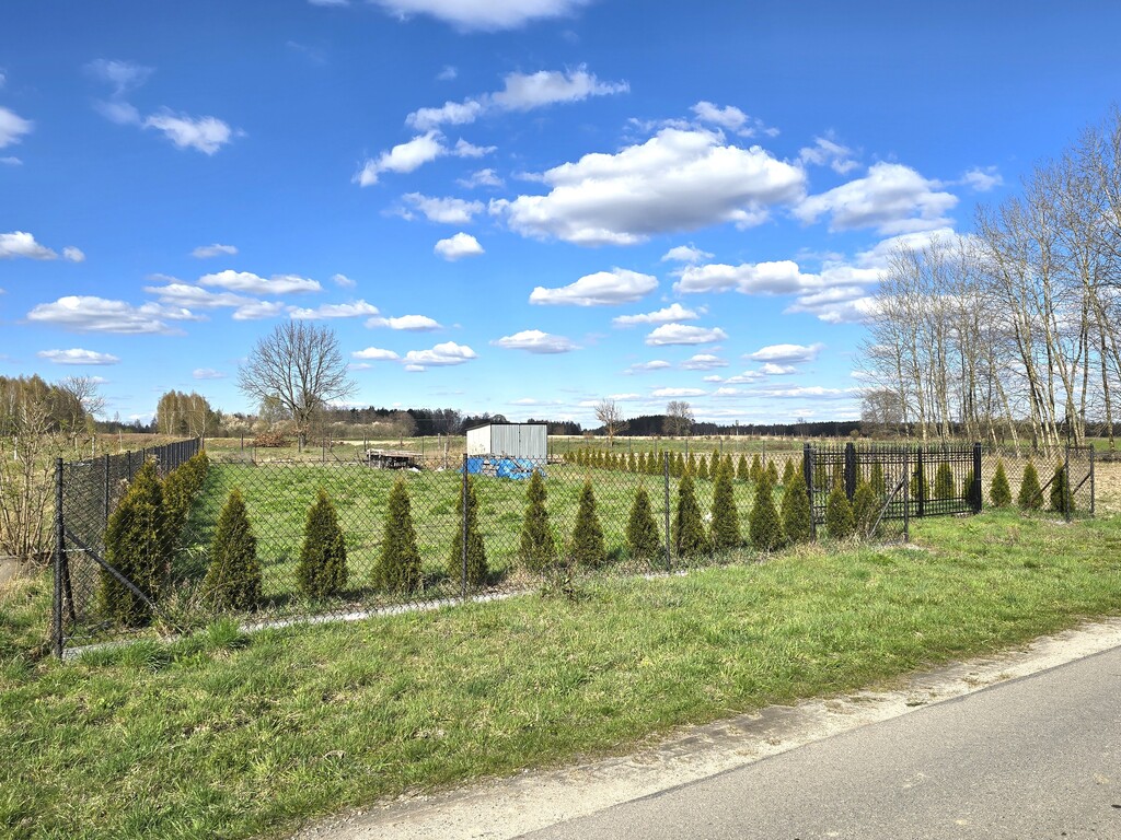 Działka położona przy drodze asfaltowej, częściowo ogrodzona siatką.