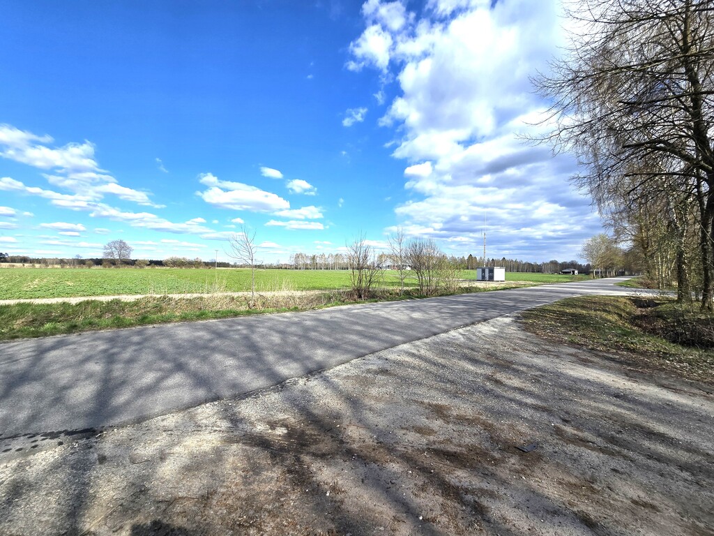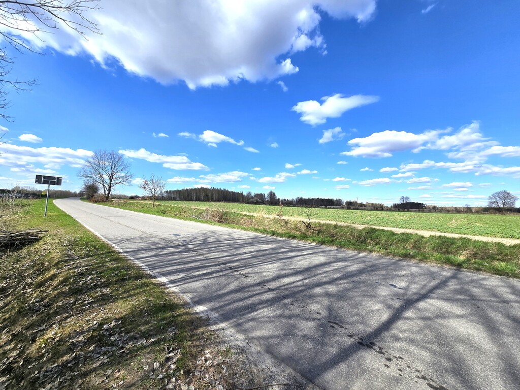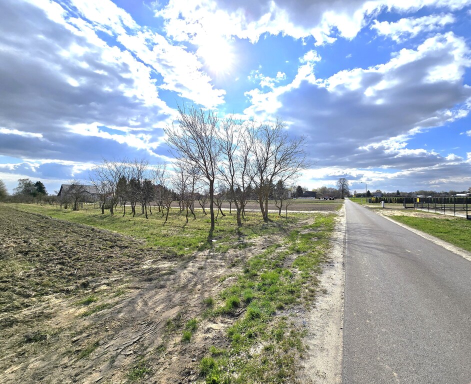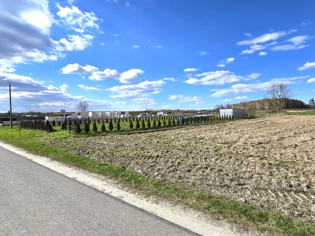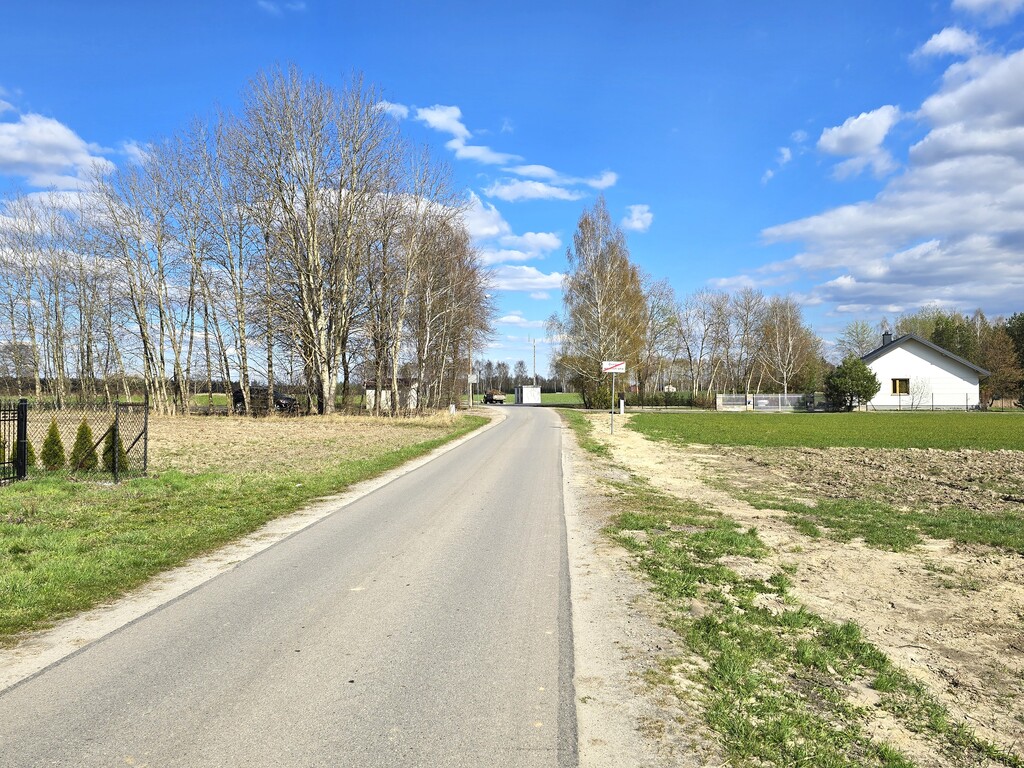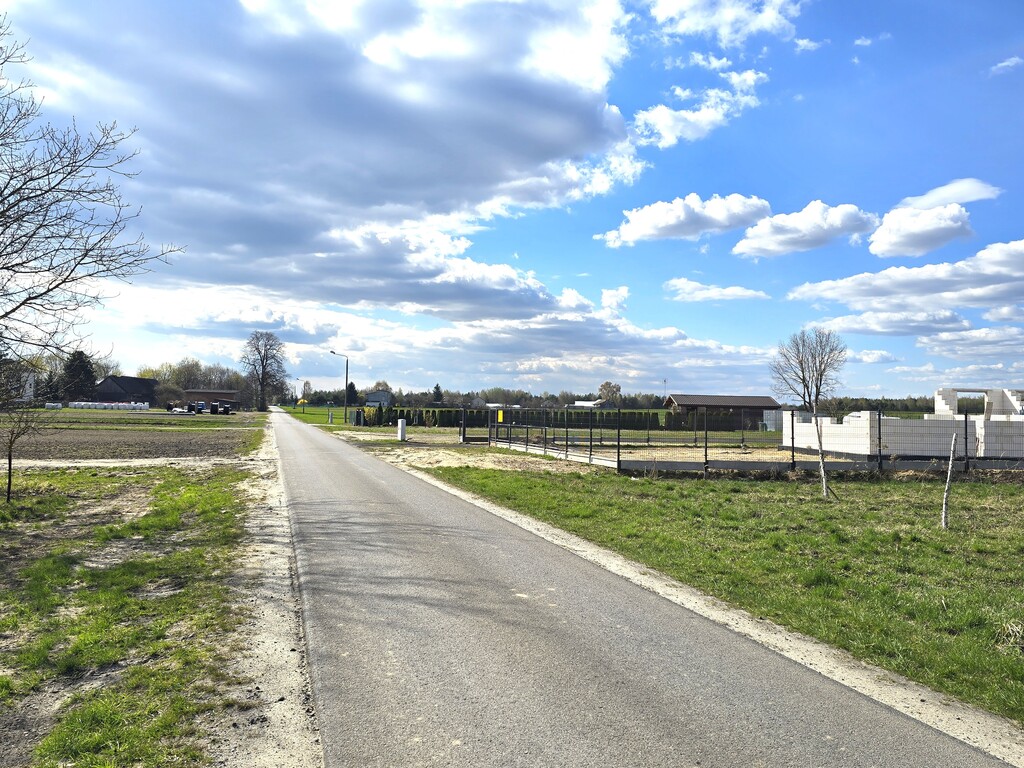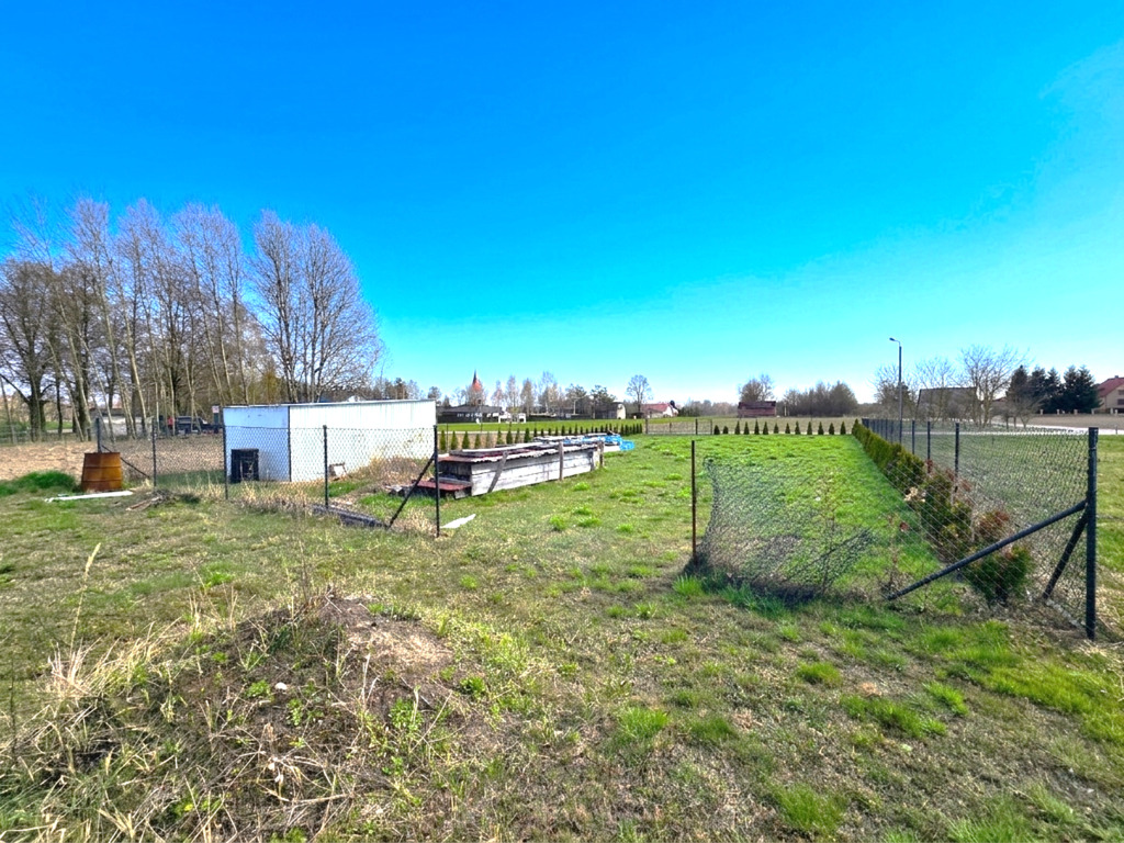 Działka położona przy drodze asfaltowej, częściowo ogrodzona siatką.