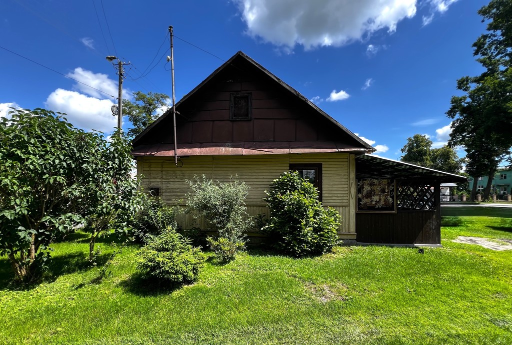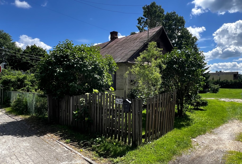 Dom zbudowany w latach 60-tych XX wieku, z bali sosnowych, dach pokryty blachą,