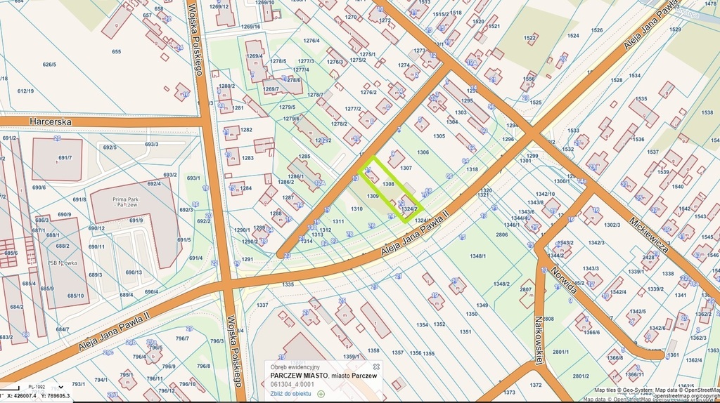 Działka na szerokości 16,5 metra przylega do ulicy Sienkiewicza, strona północno-wschodnia,