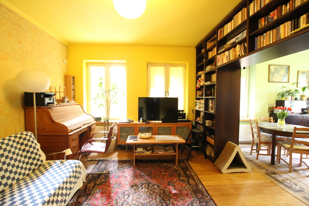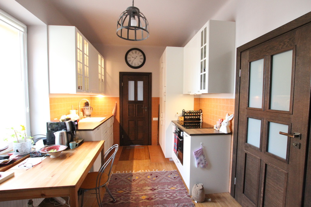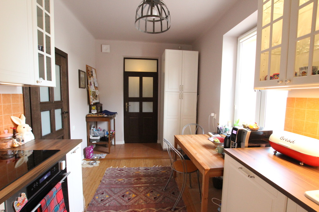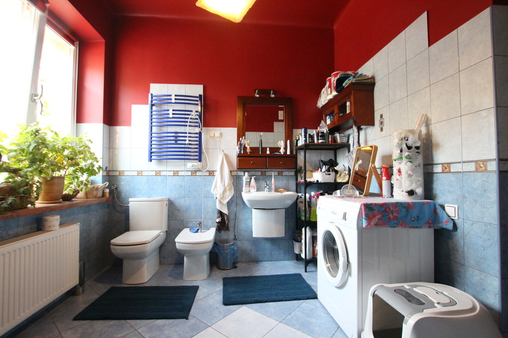 Na podłogach w kuchni i łazienkach terakota, w pokojach parkiety.