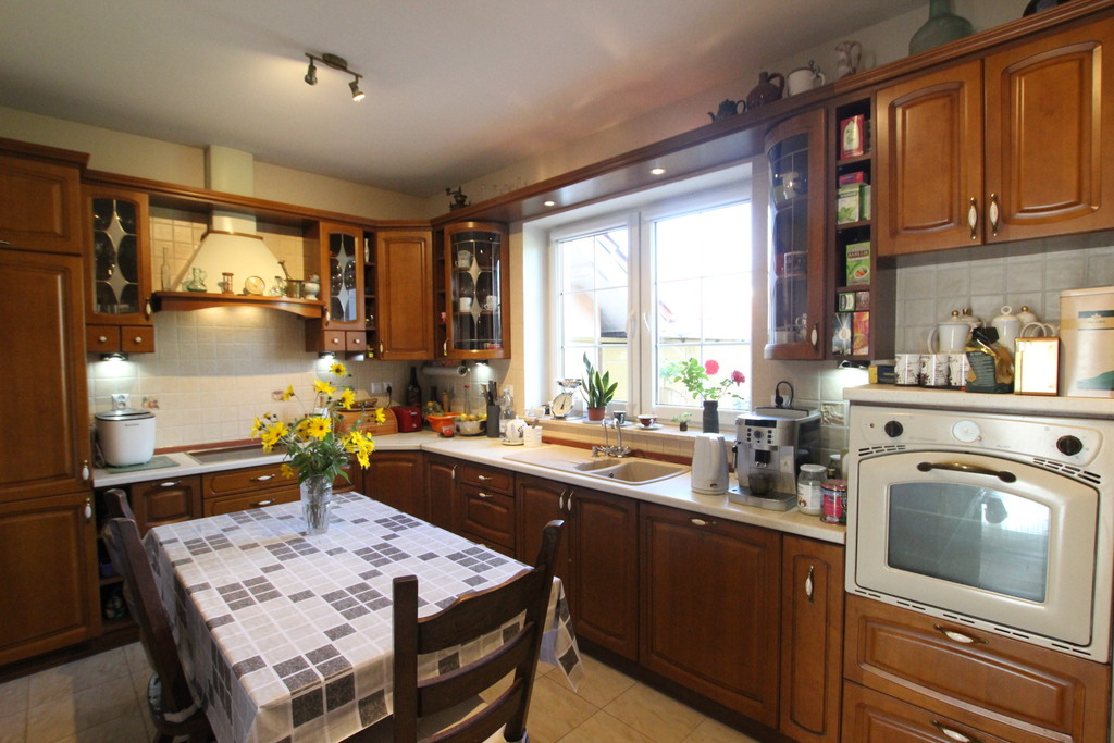 Dom wolno-stojący, murowany (pustak ceramiczny MAX 30 cm + styropian 15 cm), wybudowany w 2012 roku, kryty dachówką ceramiczną, o pow. użytkowej 138,6 m2 , posadowiony na działce o pow. 1006 m2
