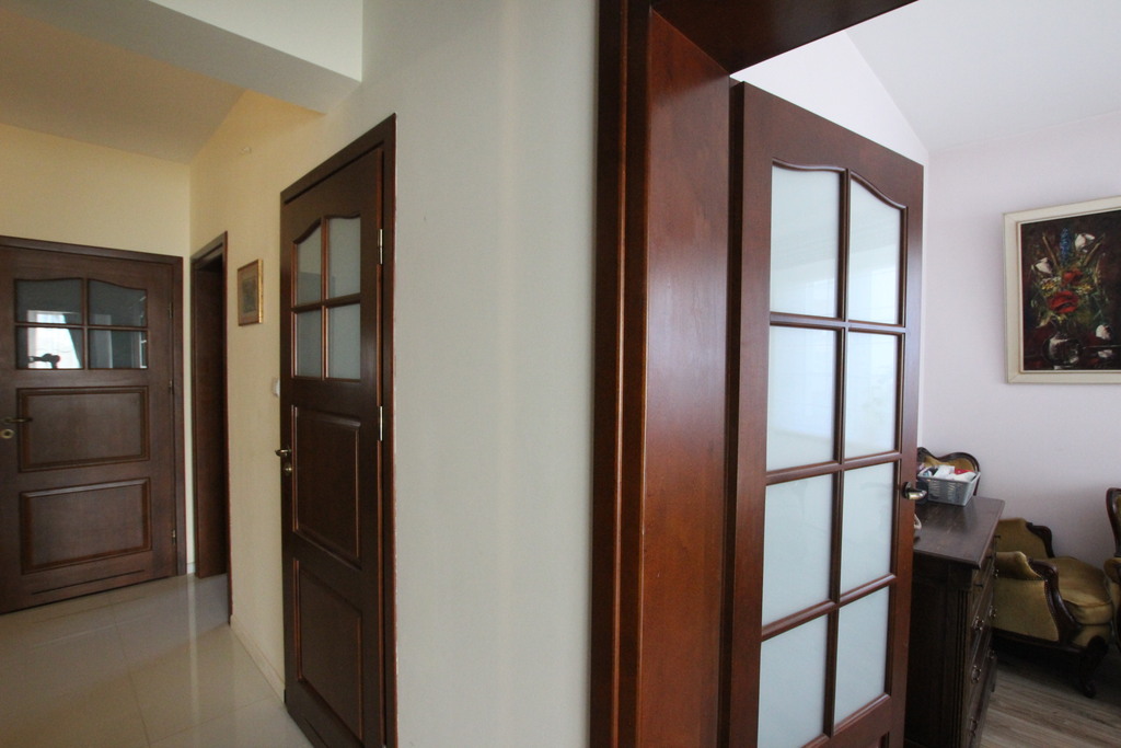 W salonie na podłodze parkiet dębowy, w pokojach panel winylowy i panel MDF oraz wykładzina, w kuchni, łazienkach i holu gres.