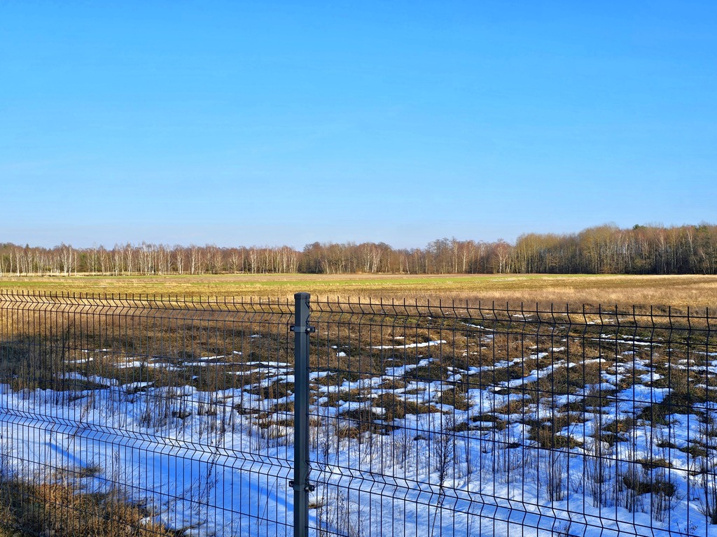 Działka w kształcie prostokąta o wymiarach 47 x 64 m, w całości ogrodzona; z trzech stron panele metalowe, od strony sąsiada betonowy płot. Od ulicy wjazd i miejsca parkingowe wyłożone kostką brukową.