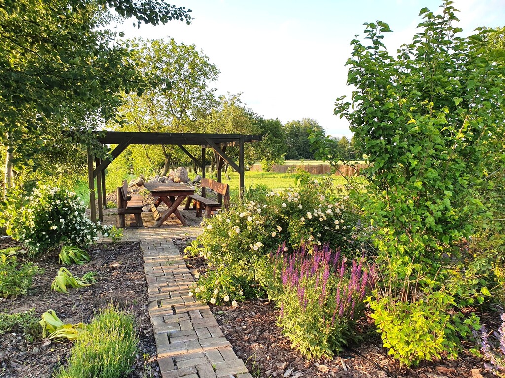 Przygotowane drewniane ławy wokół ogniska. Na granicy ogrodu i sadu drewniana altana. W sadzie stare odmiany jabłoni i olbrzymi orzech włoski.