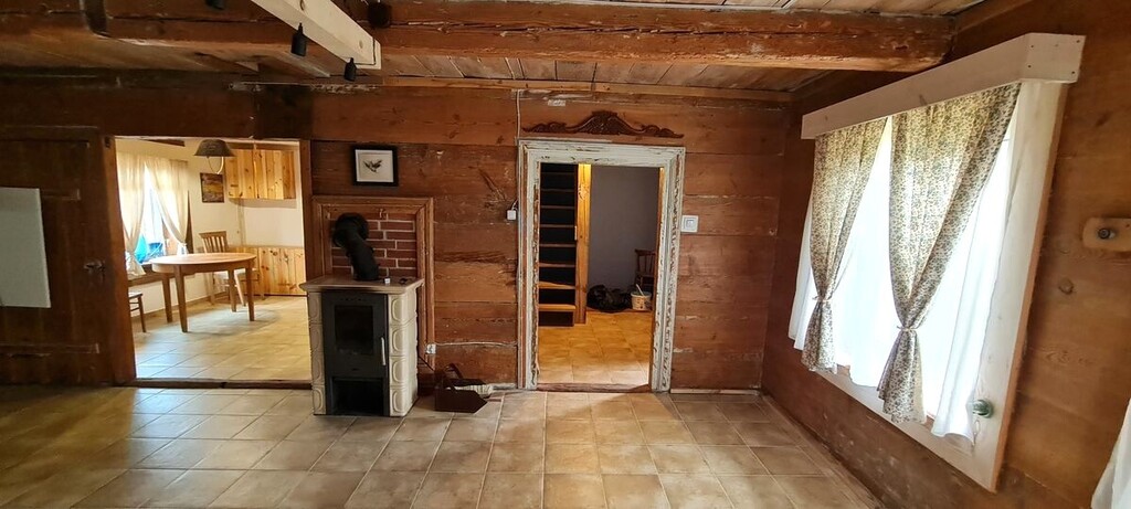 reszta ścian z ekspozycją doskonale zachowanych ponad 100-letnie bali sosnowych tworzących unikalny klimat domu.