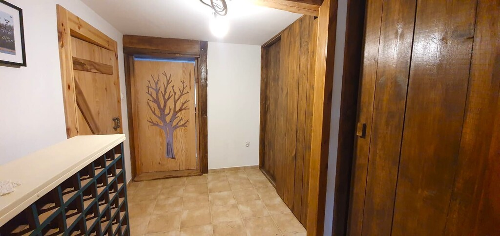 - Korytarz (9,20 m2) łączący kuchnię z pokojem wypoczynkowym wraz z drewnianą zabudową.