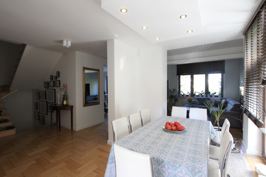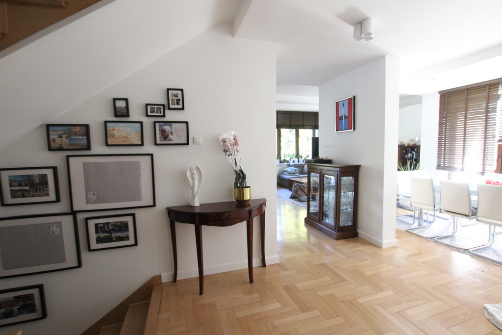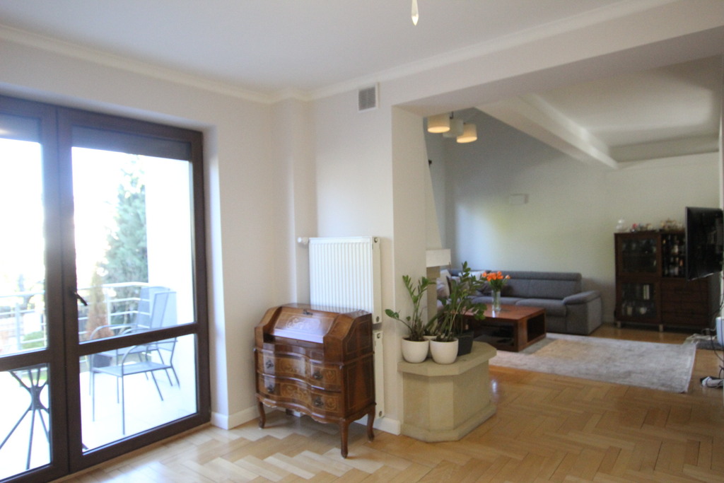 WYSOKI PARTER I PIĘTRO - odrębne wejście - salon z kuchnią, antresola, 2 pokoje, łazienka z wanną, łazienka z prysznicem, taras z wyjściem do ogrodu.